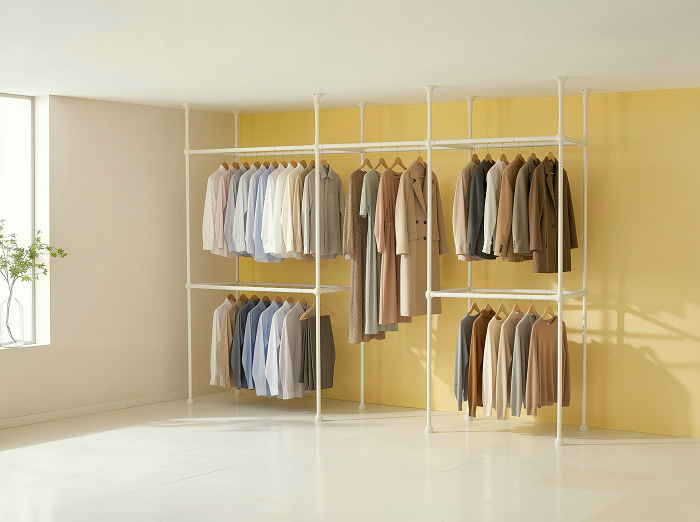 이지온(EASYON)의 레몬 더블 드레스룸 행거는 벽 타공 없이 설치 가능한 확장형 시스템 행거로, 주거 공간의 구조를 훼손하지 않으면서도 효율적인 드레스룸 구성이 가능하다. 바닥과 천장을 지지하는 4기둥 구조를 적용해 하중을 고르게 분산시키며, 많은 양의 의류를 거치하더라도 안정적인 사용이 가능하도록 설계됐다.