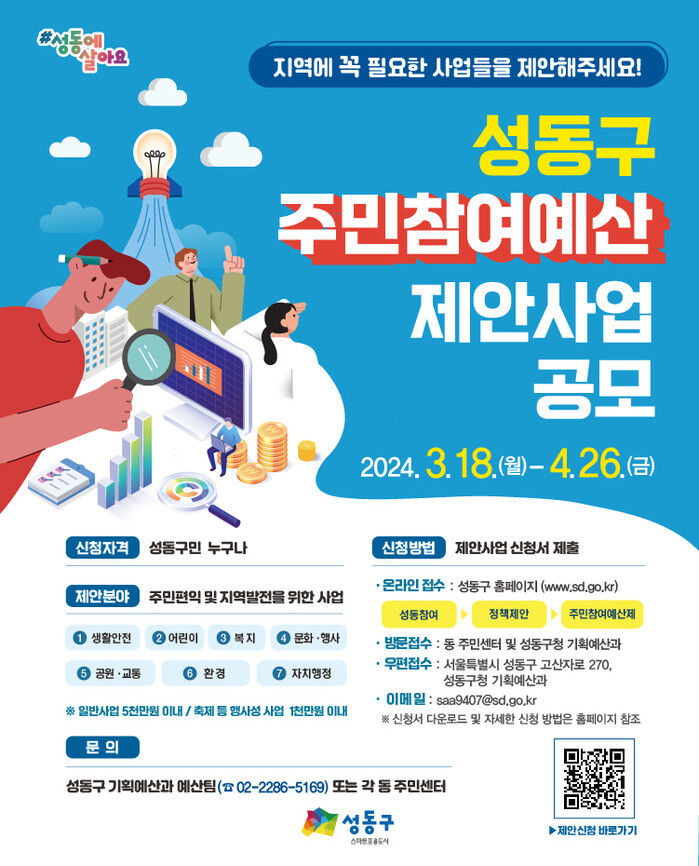 [시민일보 = 이대우 기자] 성동구(구청장 정원오)가 오는 4월26일까지 내년도 예산 편성 과정에 주민들의 의견을 반영하기 위한 ‘2025년도 성동구 주민참여예산 제안사업’을 공모한다.
