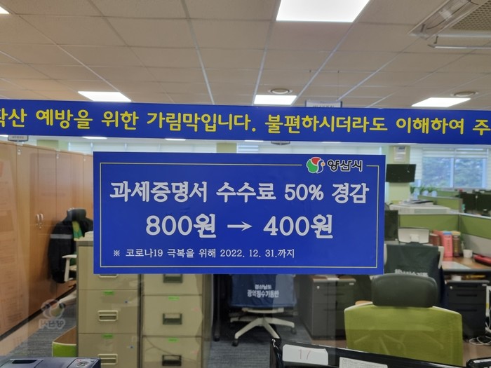 올해도 조례를 개정하여 올 연말까지 한시적으로 제증명 등 수수료를 50% 경감한다.