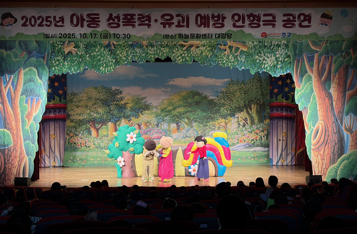 [인천=문찬식 기자] 인천 중구(구청장 김정헌)는 지난 17일 영종 하늘문화센터 대강당에서 관내 어린이집 미취학 아동 300여 명을 대상으로 어린이 성범죄 예방을 위한 인형극 공연 ‘호랑이를 물리친 오누이’를 실시했다.