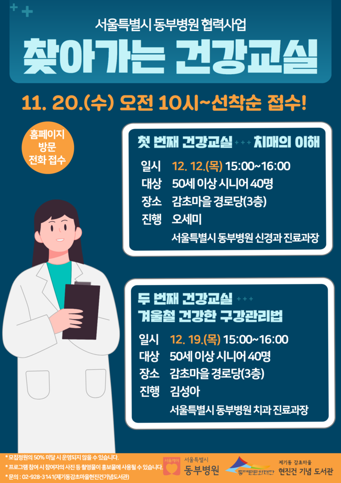 이번 프로그램은 12월 12일과 19일, 매주 목요일 오후 3시부터 감초마을 경로당에서 50세 이상의 시니어를 대상으로 진행된다. ▲첫 번째 건강교실(12/12) ‘치매의 이해’는 치매의 증상 파악과 올바른 치매 정보 제공을 주제로 서울특별시 동부병원 신경과 오세미 진료과장이 강의하며 ▲두 번째 건강교실(12/19) ‘겨울철 건강한 구강관리법’은 시니어의 구강질환 증상 및 치료법, 예방수칙에 대해 서울특별시 동부병원 김성아 치과 진료과장이 설명할 예정이다.