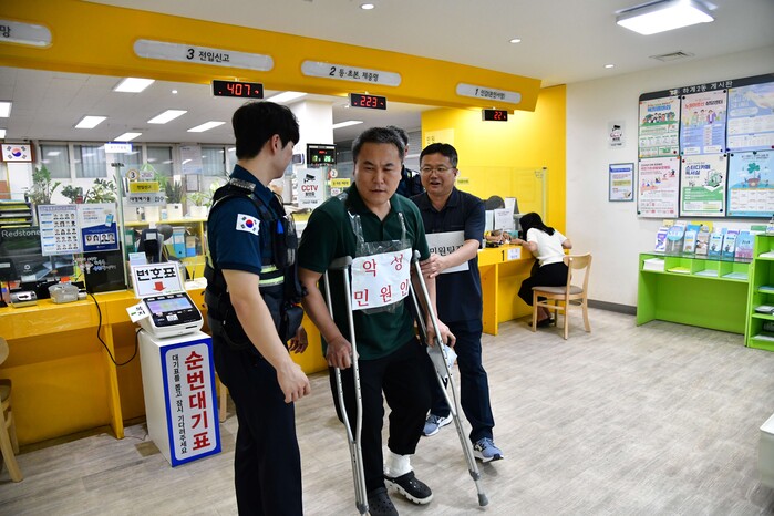 민원여권과 모의훈련은 서류 미비로 이혼신청서가 수리될 수 없는 상황에서 민원인이 담당 직원을 폭행하는 상황을 가상으로 연출했다.