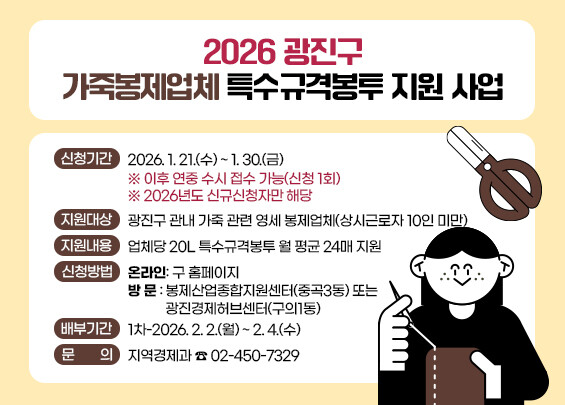 봉투는 업체별 실 사용량과 연간 수요를 고려해 차등 지급하며, 봉제산업종합지원센터와 광진경제허브센터 등 지정 장소를 선택해 수령할 수 있다. 자세한 사항은 광진구청 지역경제과또는 광진구봉제산업종합지원센터로 문의하면 된다.