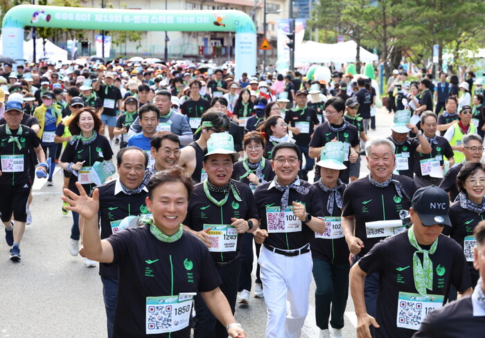 구로구가 지난 3일 G밸리(서울디지털산업단지)1~3단지 전역에서 금천구와 함께 '제19회 G밸리 스마트 마라톤 대회'를 개최했다. 사진은 제19회 G밸리 스마트 마라톤 대회에서 문헌일 구청장(앞줄 가운데)과 참가자들이 뛰고 있는 모습. (사진=구로구청 제공)