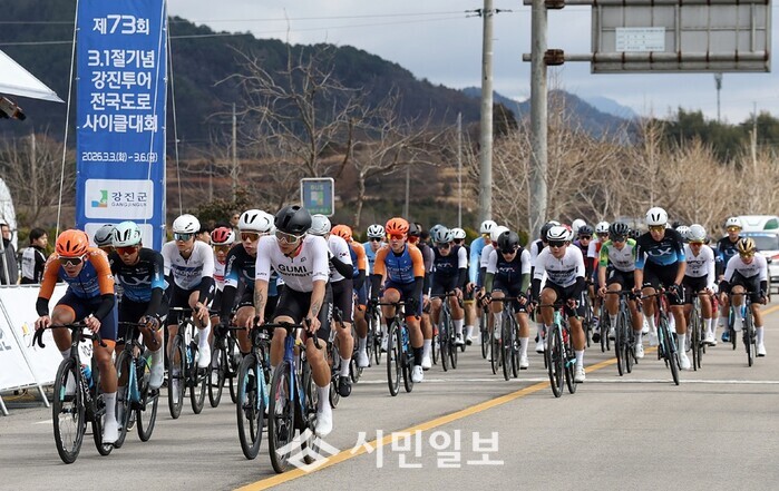[강진=정찬남 기자] 제73회 3.1절 기념 강진 투어 전국도로사이클 대회가 3일 개막한 가운데 대회 첫째 날 남자부 경기에 참가한 고등부와 일반부 선수들이 혼신의 힘을 다해 질주하고 있다.