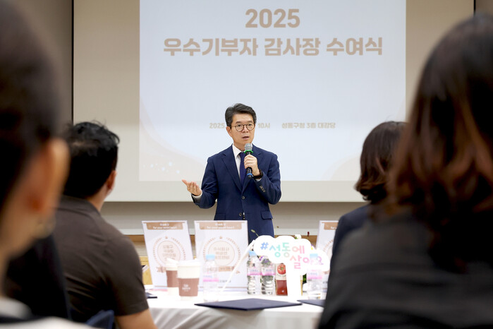 서울 성동구가 최근 우리 주변의 어려운 이웃에게 나눔을 실천해 온 기부자들에게 감사의 마음을 전하고자 '2025 우수기부자 감사장 수여식'을 개최했다. 사진은 수여식에서 정원오 구청장이 인사말을 하는 모습. (사진=성동구청 제공)