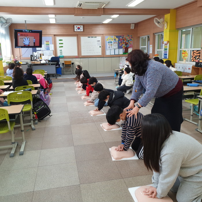 충남 아산시가 최근 배방초등학교 2학년 학생들을 대상으로 '2021년 제2차 찾아가는 어린이 안전체험교실'을 개최했다. 교육은 온라인 화상 프로그램을 활용해 실시간으로 심폐소생술·수상안전·자연재난 등에 대한 체험형 안전 교육으로 진행됐다. 사진은 이날 심폐소생술 교육이 진행되고 있는 모습. (사진제공=아산시청)