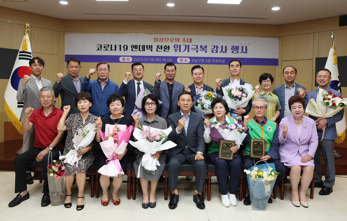 강남구는 2020년 2월 26일 코로나19 첫 확진자 발생 이후 누적 확진자 수가 33만 219명(23.6.30기준)으로 서울에서 3번째로 많았다. 이에 대응하기 위해 구는 전국 최초 스마트 문진표 개발, 선별진료소 원스톱 자동화시스템 구축, 신속 역학조사반 운영, 독거노인 등 취약계층 전담반 운영, 학교방역단 창단 등 선진 시스템을 개발·추진했고, 여러 기관, 단체, 구민들이 적극적으로 협력해 코로나19 사망률이 서울시 21위에 그칠 수 있었다.