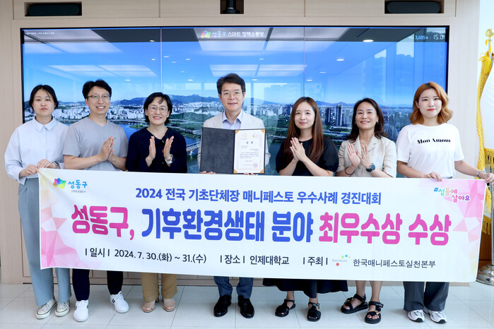 [시민일보 = 이대우 기자] 서울 성동구(구청장 정원오)가 ‘2024 전국 기초단체장 매니페스토 우수사례 경진대회’에서 ‘기후환경생태 분야’ 최우수상을 수상해 8년 연속 최우수상의 영예를 얻었다.
