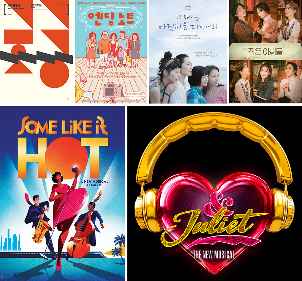 | ▲ (위)뮤지컬 <빠리빵집>, 영화 <엔딩노트>, 영화 <바닷마을 다이어리>, 연극 <작은 아씨들> 포스터, 제공: 우란문화재단, 영화사 진진, 티캐스트, 라이브러리컴퍼니 (아래)뮤지컬 <뜨거운 것이 좋아> 포스터, 뮤지컬 <앤줄리엣> 사진, 제공: ㈜라이브러리컴퍼니 |