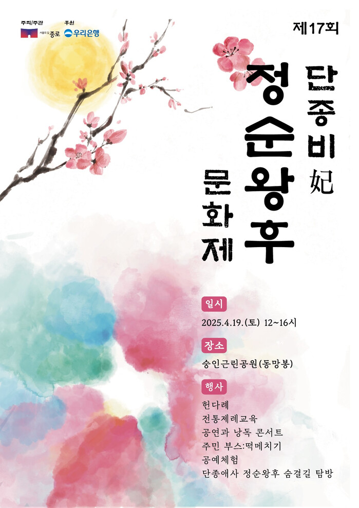 [시민일보 = 이대우 기자] 종로구(구청장 정문헌)가 오는 19일 낮 12시~오후 4시 숭인근린공원 동망봉에서 ‘제17회 단종비 정순왕후 문화제’를 개최한다.