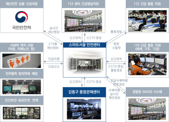'스마트서울 안전망'(통합 플랫폼)은 범죄, 화재, 안전사고 등 긴급상황 발생 시 사건·사고 발생 지역 주변 CCTV 영상을 활용해 현장 상황을 신속하게 파악하고 대응할 수 있도록 강동구 CCTV 통합관제센터와 서울시, 경찰, 소방 등 유관 기관을 연계하는 시스템이다.