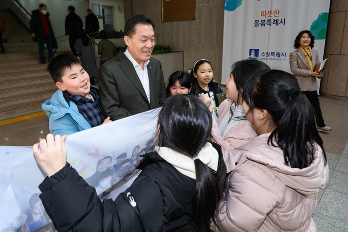 이재준 경기 수원시장이 아동친화도시 조성을 위해 지역내 초등학생들을 시청에 초청해 의견을 들었다. 사진은 이 시장이 The꿈지역아동센터 이용 초등학생들과 인사를 나누는 모습. (사진=수원시청 제공)