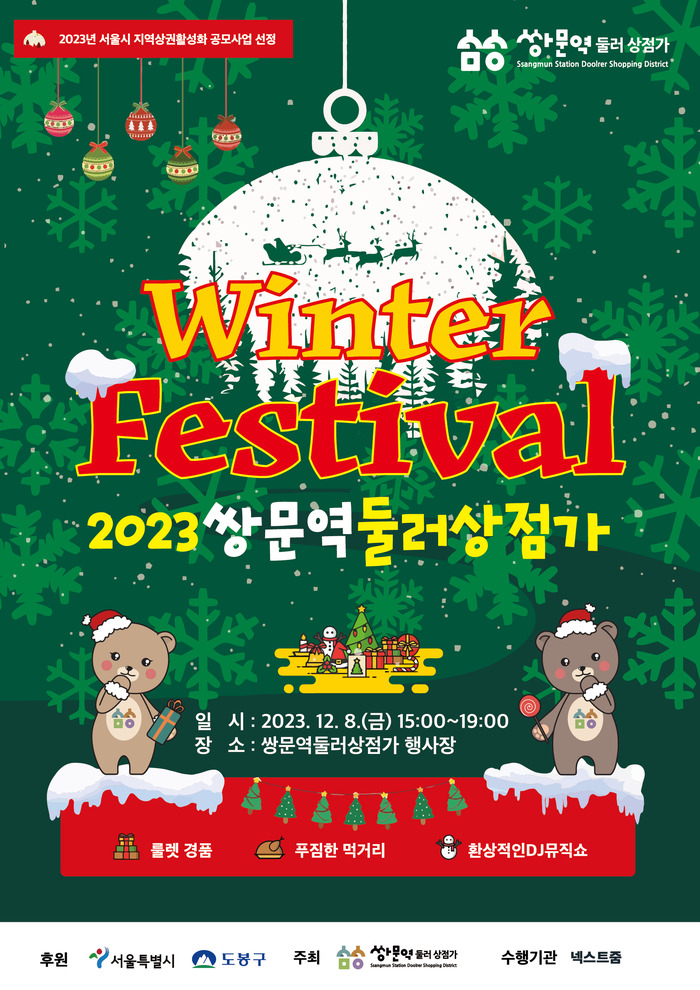 [시민일보 = 여영준 기자] 도봉구(구청장 오언석)가 오는 8일 오후 3~7시 쌍문역 둘러상점가(노해로60길 일대)에서 ‘2023년 쌍문역 둘러상점가 윈터 메스티벌’을 연다고 밝혔다.