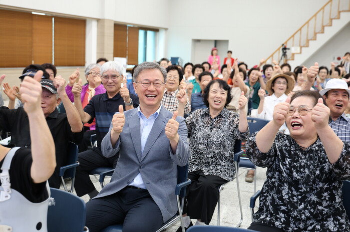 서울 구로구가 16일 구청 강당에서 제13기 ‘일소일소(一笑一少) 어르신 문화대학’ 개강식을 개최했다. 사진은 장인홍 구청장이 노인들과 함께 프로그램에 참여하는 모습. (사진=구로구청 제공)