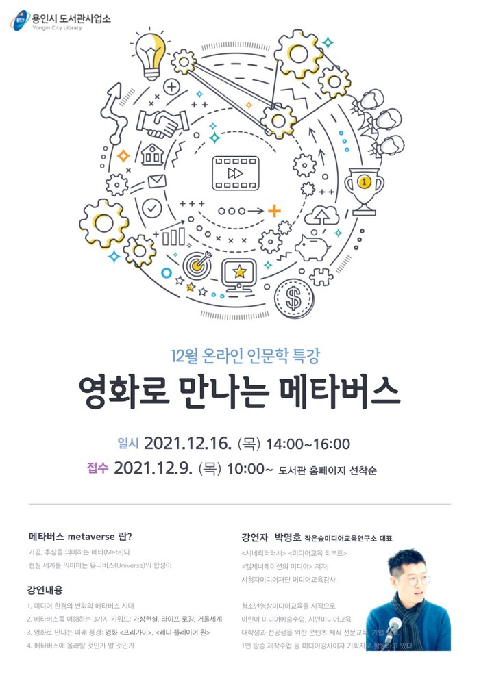 [용인=오왕석 기자] 용인시 도서관사업소가 9일부터 온라인 인문학 특강 ‘영화로 만나는 메타버스’의 참가자를 모집한다.