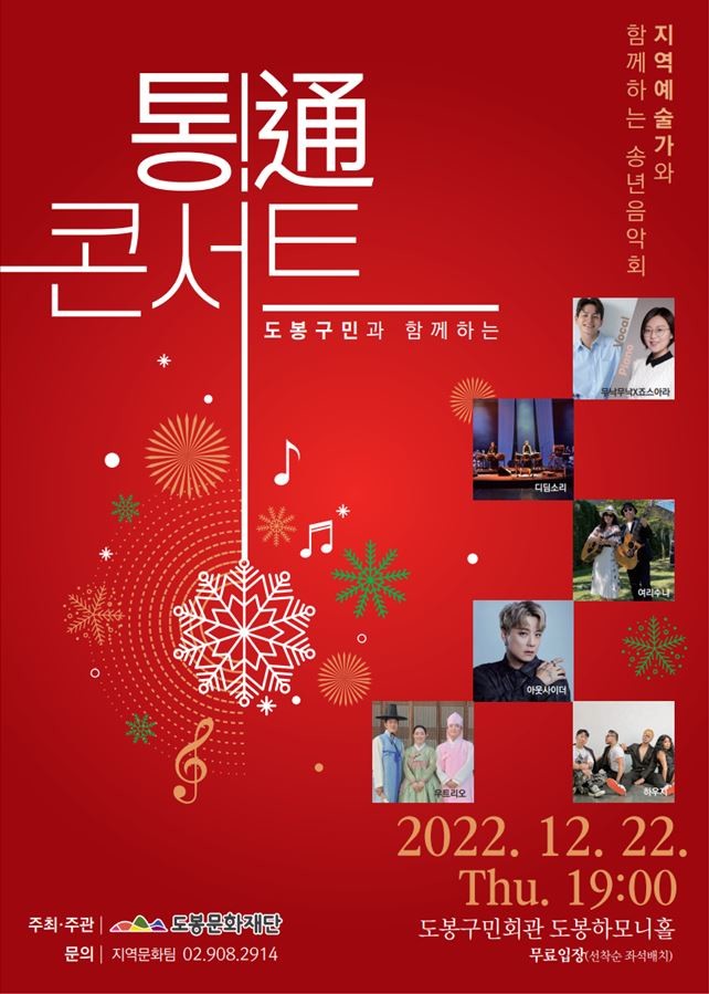 오언석 구청장은 “통통 콘서트를 통해 도봉구의 예술가와 주민들이 서로 통하는, 통통 튀는 재미가 있는 무대를 즐길 수 있을 것이다. 구민들에게 이번 송년콘서트가 2022년을 마무리하는 즐거운 시간이 되기를 바란다.”라고 말했다.