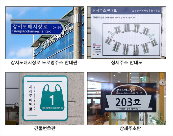 또 시장 내 18개 건물에 고유의 건물번호, 점포 588곳에 각각의 상세주소를 부여했다. 예컨대, 수협공판장은 강서도매시장로 130, 청과물동은 강서도매시장로 65 등으로 새로운 주소가 부여된 것이다.