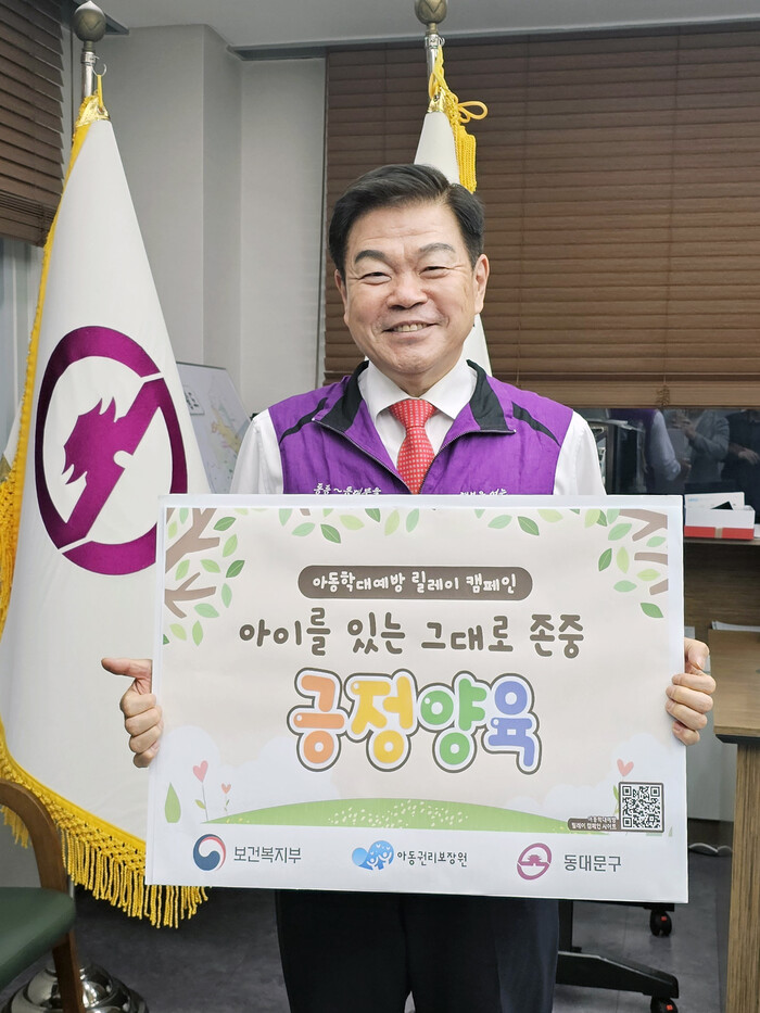 [시민일보 = 이대우 기자] 이필형 동대문구청장이 지난 3일 ‘아동학대 예방 릴레이 캠페인에’ 동참하며 아동·청소년이 행복한 동대문구를 만들겠다고 다짐했다.