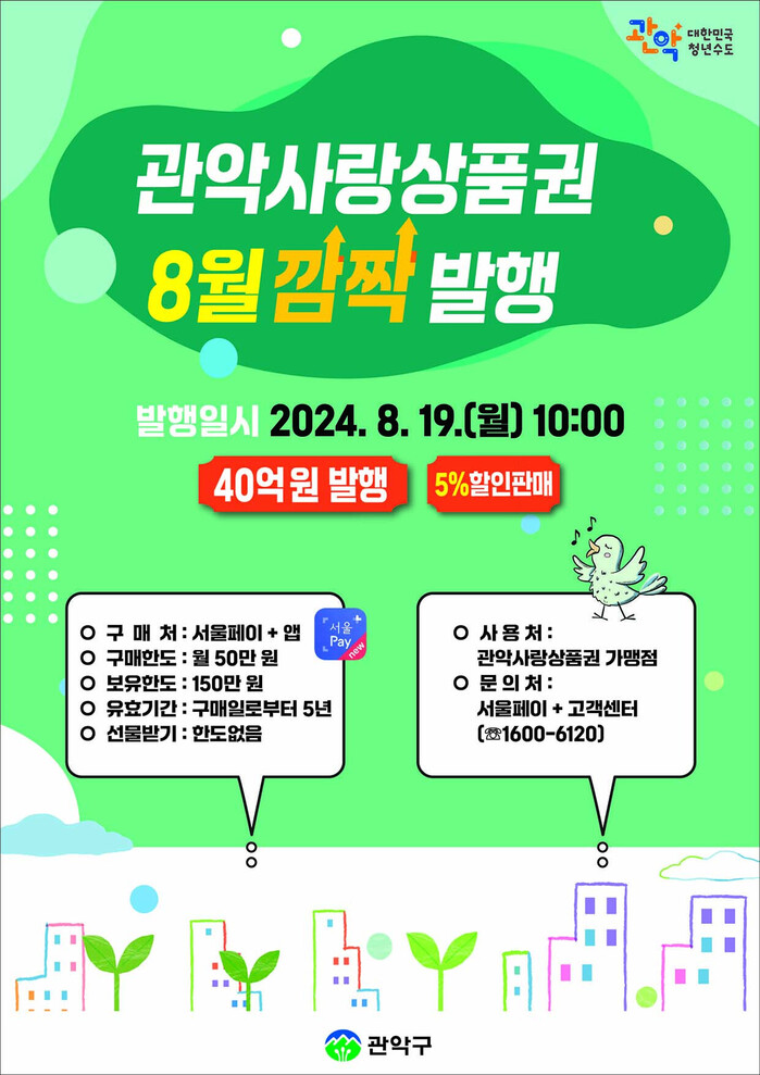 [시민일보 = 여영준 기자] 관악구(구청장 박준희)가 막바지 휴가철을 맞아 오는 19일 오전 10시부터 40억원 규모의 제3차 관악사랑상품권을 발행한다고 밝혔다.