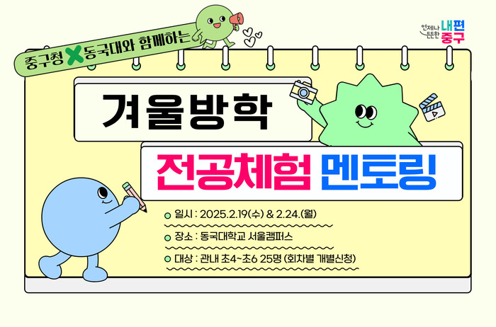[시민일보 = 여영준 기자] 중구가 겨울방학 중인 초등학생들을 위해 동국대학교와 함께 ‘원데이 전공 체험 멘토링’을 진행한다.