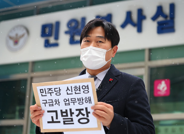 국민의힘 소속 이종배 서울시의원은 이날 오전 9시30분께 서울경찰청 앞에서 기자회견을 열고 신 의원을 "위력에 의한 업무방해 혐의로 서울경찰청에 형사고발했다"고 밝혔다.