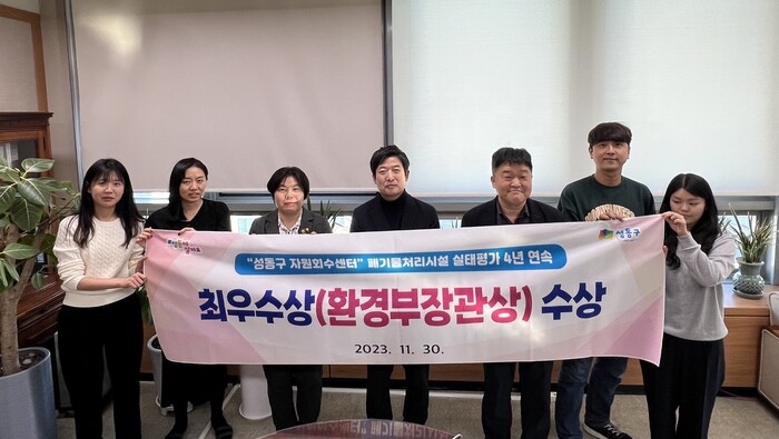 성동구는 지난 11월 30일 환경부 주최, 한국환경공단 주관으로 부산시에서 열린 ‘2023년 폐기물처리시설 정책공유 워크숍’에서 폐기물처리시설 운영실태평가에서 최우수시설로 선정되어 환경부장관상과 함께 최우수 인증 현판을 수여받았다.