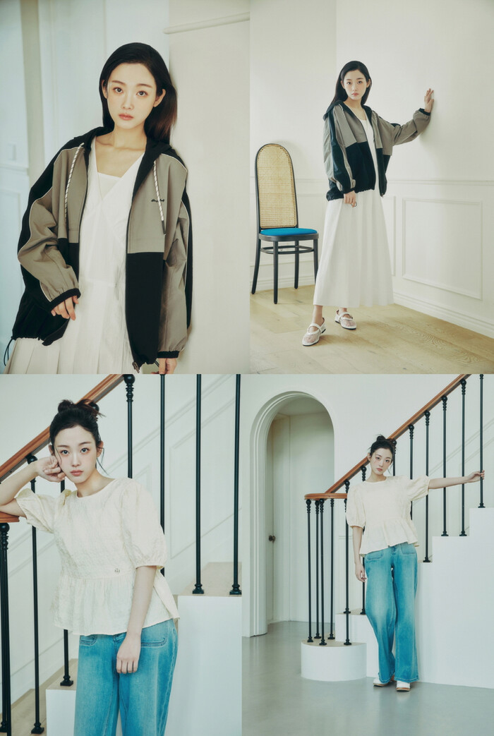 쥬시쥬디 모델 이유미는 특유의 표현력으로 브랜드 아이덴티티에 꼭 맞춘 다양한 스타일링을 완벽히 소화했다. 첫 번째 화보에서는 집업점퍼와 플리츠 롱 원피스를 믹스매치했다. 컬러블록으로 배색 포인트를 준 후드형 점퍼를 드레시한 원피스의 위에 레이어드해 여성스러우면서도 캐주얼한 상반된 매력을 표현했다. 사이드 포켓에 손을 넣고 벽에 가볍게 기댄 이유미의 모습은 도시적인 무드를 완성한다.