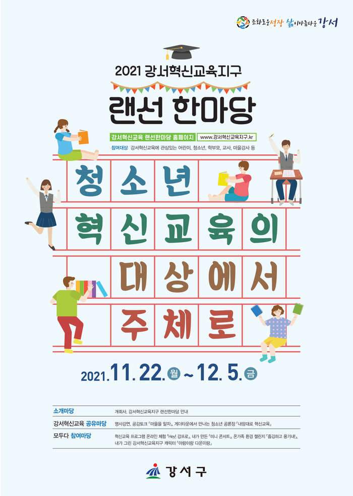 [시민일보 = 홍덕표 기자] 서울 강서구(구청장 노현송)가 오는 22일부터 12월5일까지 민·관·학이 함께 하는 '2021 강서혁신교육지구 랜선 한마당'을 개최한다.