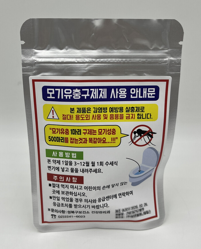 성북구보건소 관계자는 “어린이와 반려동물이 닿지 않도록 보관하고, 유충구제 외 용도로 사용하거나 섭취하지 않도록 각별한 주의가 필요하다”고 밝혔다.