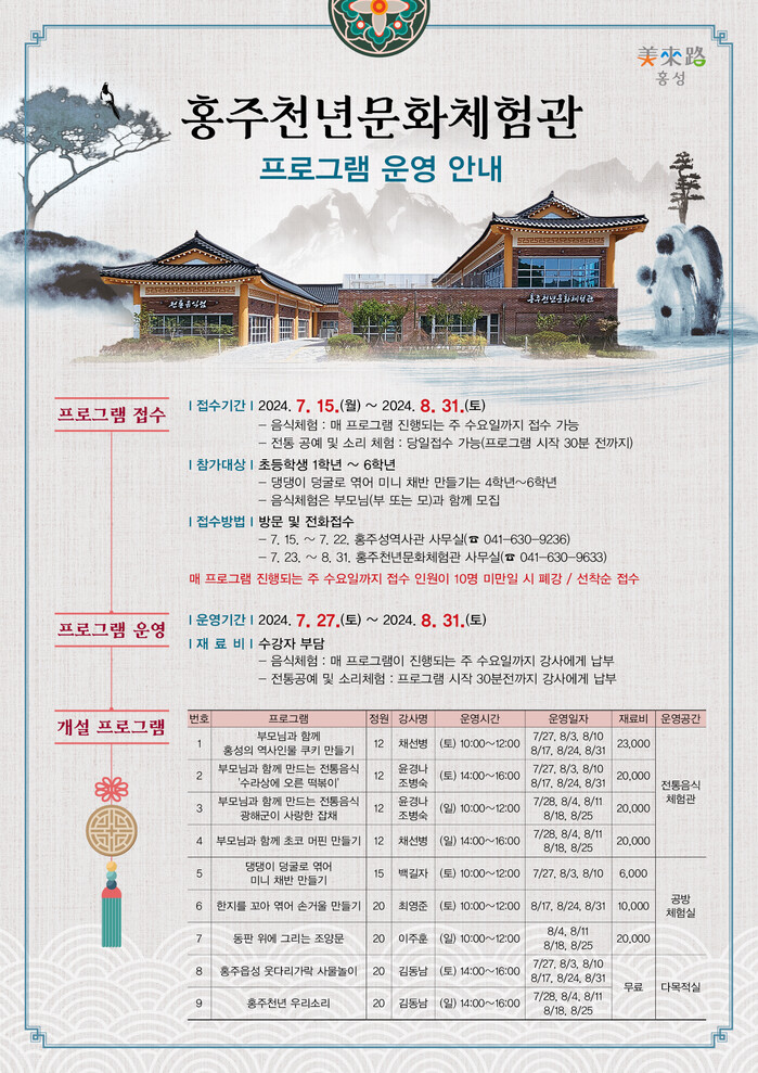 [홍성=최복규 기자] 충남 홍성군이 오는 22일 개관하는 홍주천년문화체험관에서 27일부터 8월31일까지 매주 주말마다 홍주읍성을 방문하는 모든 초등학생을 대상으로 다양한 전통문화 체험 기회를 제공할 예정이다.