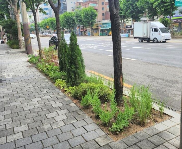 가로변 가로수와 가로수 사이 공간에 나무나 꽃을 심는 ‘정원형 띠녹지’는 녹지확보와 도시미관 개선은 물론 미세먼지 저감, 폭염 완화 효과가 있다.