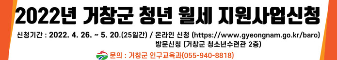 거창군은 관내 청년의 주거비 부담 완화와 정착 지원을 위해 2022년 청년 주택 월세 지원 사업 신청을 4월 26일부터 5월 20일까지(25일간) 접수한다.