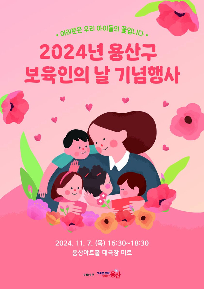 [시민일보 = 문민호 기자] 용산구(구청장 박희영)는 7일 오후 4시30분부터 용산아트홀 대극장에서 ‘2024년 용산구 보육인의 날 기념행사’를 개최한다.