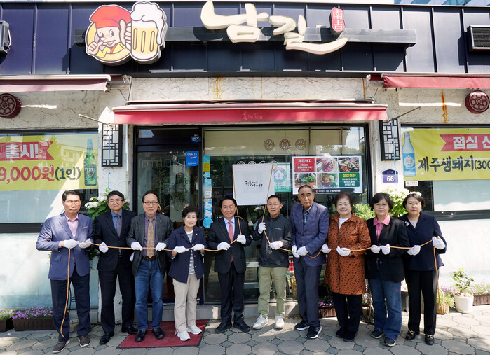 | ▲ 서대문구 충현동에 소재한 식당 ‘남길’의 김남길 대표(오른쪽 다섯 번째)와 이성헌 서대문구청장(왼쪽 다섯 번째) 등 ‘서대문 나눔1%의 기적 사업’ 현판식 참석자들이 기념 촬영을 하고 있다. (사진=서대문구청 제공) |