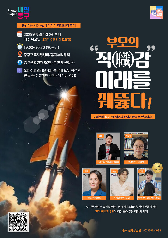 [시민일보 = 여영준 기자] 서울 중구가 급변하는 직업 흐름에 발맞춰 자녀의 진로 고민을 함께 나눌 수 있도록 '부모의 직(職)감, 미래를 꿰뚫다'를 주제로 부모특강을 개최한다.