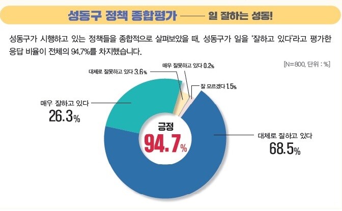 [시민일보 = 홍덕표 기자] 성동구(구청장 정원오)는 2023년 정기 여론조사 결과 구 정책 종합평가에 대한 질문에 '일을 잘하고 있다'라고 응답한 비율이 전체의 94.7%로, 주민 10명 중 9명 이상은 구정에 대해 긍정적인 평가한 것으로 확인됐다고 28일 밝혔다.