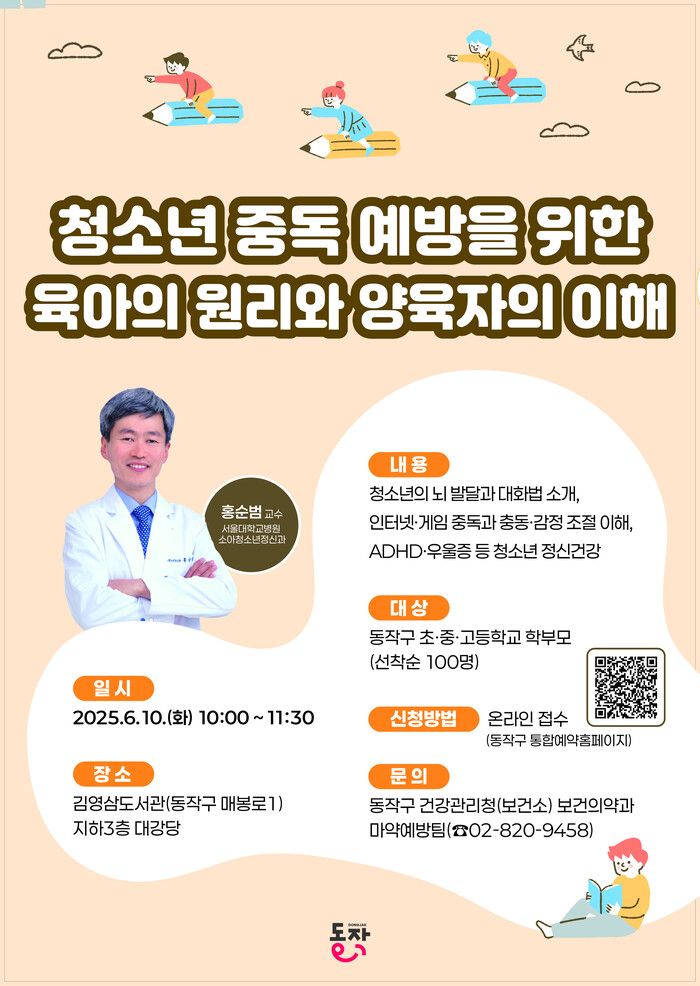 [시민일보 = 여영준 기자] 동작구(구청장 박일하)가 자녀 정신건강 관리에 관심이 깊은 학부모들을 위해 ‘청소년 중독 예방을 위한 육아의 원리와 양육자의 이해’를 주제로 전문가 특강을 개최한다고 23일 밝혔다.