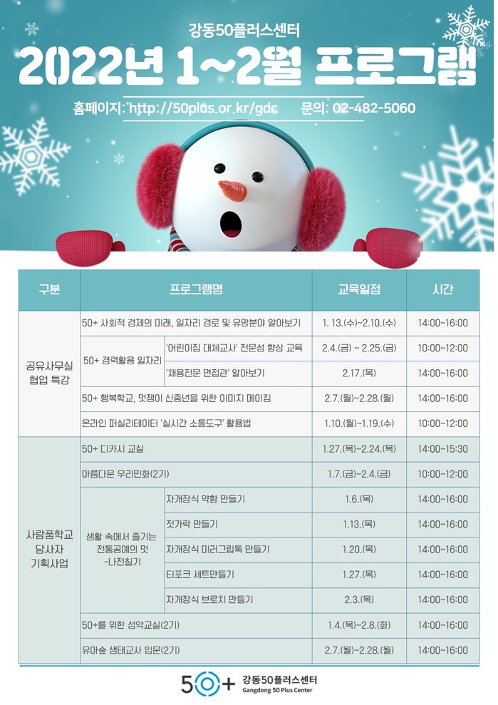 [시민일보 = 이대우 기자] 서울 강동구(구청장 이정훈)가 운영하는 ‘강동50플러스센터’에서 새해맞이 무료특강을 연다.