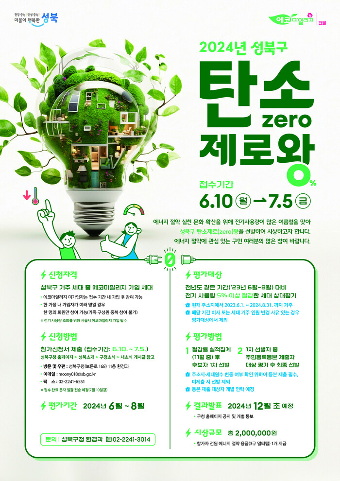 구는 6월 10일부터 7월 5일까지 ‘2024 탄소제로(zero)왕 선발 이벤트’ 참여자를 모집한다. 성북구민이라면 누구나 참여할 수 있으며, 전기 사용량 조사를 위해 서울시 에코마일리지 가입이 필수다.