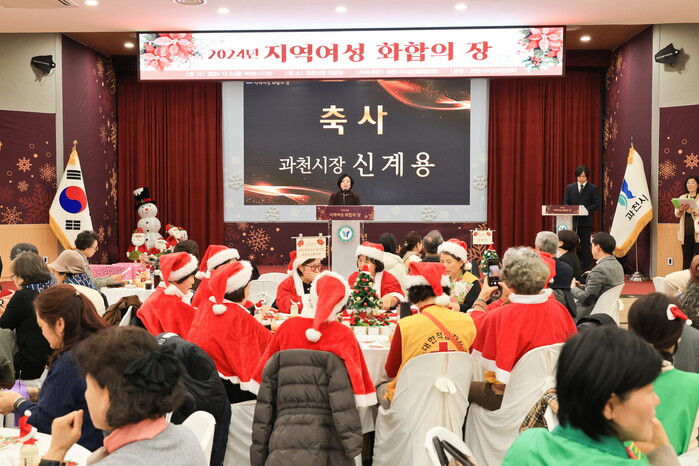 경기 과천시가 최근 시청 대강당에서 여성단체협의회 주관으로 ‘2024년 지역여성 화합의 장’을 열었다. 이번 행사는 지역내 여성단체와 여성동아리가 한자리에 모여 교류와 협력을 다지는 동시에, 지역사회 발전에 기여한 여성의 역할을 재조명하는 자리로 마련됐다. 사진은 행사에 참석한 신계용 시장이 인사말을 하고 있는 모습. (사진=과천시청 제공)
