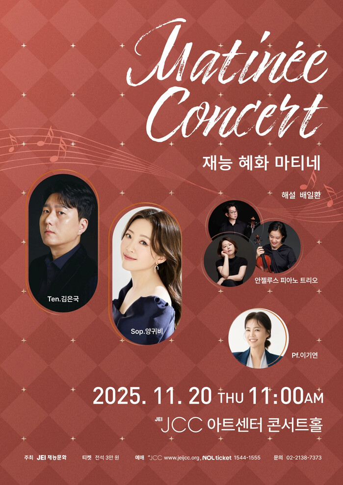[시민일보 = 여영준 기자] 재능문화는 테너 김은국, 소프라노 양귀비, ‘제1회 재능실내악 콩쿠르’에서 금상을 수상한 안젤루스 피아노 트리오의 재능 혜화 마티네 공연을 JCC 아트센터 콘서트홀에서 오는 20일에 개최한다고 11일 밝혔다.