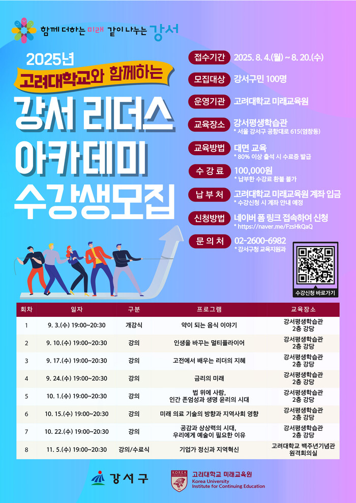 이번 강의는 강서평생학습관(공항대로 615) 2층 대강당에서 진행되며, 마지막 강의는 고려대학교 백주년기념관에서 열린다.