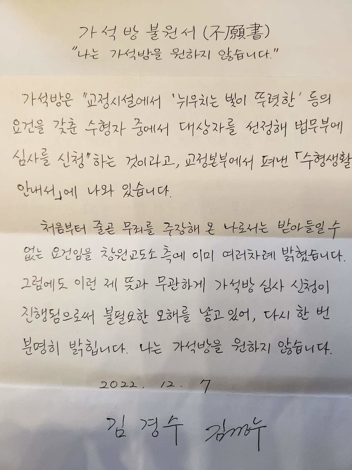 전날 김 전 지사는 부인 김정순씨를 통해 자신의 페이스북에 게시한 자필 '가석방 불원서'를 통해 "나는 가석방을 원하지 않는다"고 밝혔다.