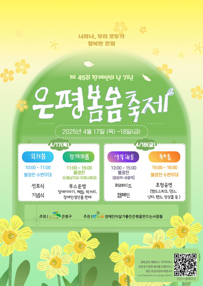 [시민일보 = 이대우 기자] 은평구(구청장 김미경)가 제45회 장애인의 날 기념해 오는 17~18일 불광천에서 장애인과 비장애인 함께 참여하는 소통과 화합의 장인 ‘은평봄봄축제‘를 개최한다고 밝혔다.