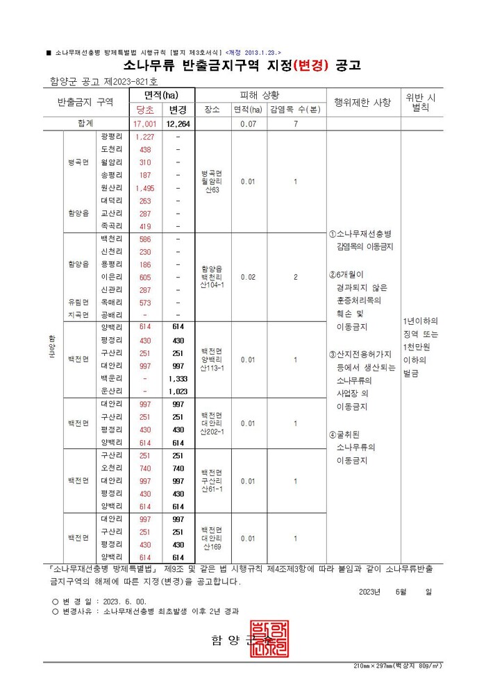 ‘소나무류 반출금지구역’은 소나무류재선충병이 발생하게되면 『소나무재선충병 방제특별법』에 따라 철저한 방제를 위해 위험인자인 소나무류 및 재선충병 매개충 박멸을 위해 이동을 금지하는 것이다.