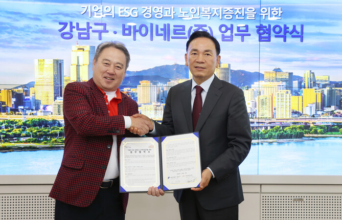 바이네르는 1994년에 설립된 제화 기업으로, 편안한 착용감의 신발(컴포트화)로 주목받으며 고령층 건강을 위한 다양한 사회공헌 활동을 이어오고 있다. 특히, 김원길 대표는 어르신들이 신체 활동을 통해 건강을 유지할 수 있도록 돕는 데 각별한 관심을 갖고, 직접 작사·작곡한 노래로 어르신들이 즐겁게 참여할 수 있는 활동을 후원해 왔다. 이번 협약을 통해 강남구와 바이네르는 어르신의 활기찬 생활을 위한 맞춤형 지원을 펼치기로 합의했다.