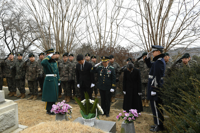 | ▲ 김홍일 장군 묘소를 참배하고 있는 육군 제52사단 212여단 장병 |
