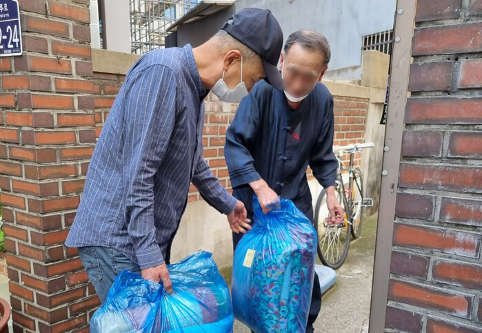| ▲ 1인가구 어르신이 엄지척 세탁 서비스 이용하여 세탁물을 전달하는 모습 (사진=성동구청 제공) |