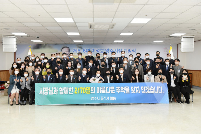 이성호 경기 양주시장이 지난 24일 퇴임식을 끝으로 6년간의 시장 업무를 마무리했다. 양주시청 대회의실에서 열린 퇴임식은 이 시장의 약력 소개를 시작으로 ▲시정활동 영상 상영 ▲국회의원·시의회 의장 인사말 ▲감사패·꽃다발 전달 ▲기념촬영 ▲환송 순으로 진행됐다. 사진은 이 시장(앞줄 가운데) 및 참여자들이 기념촬영을 하는 모습. (사진제공=양주시청)